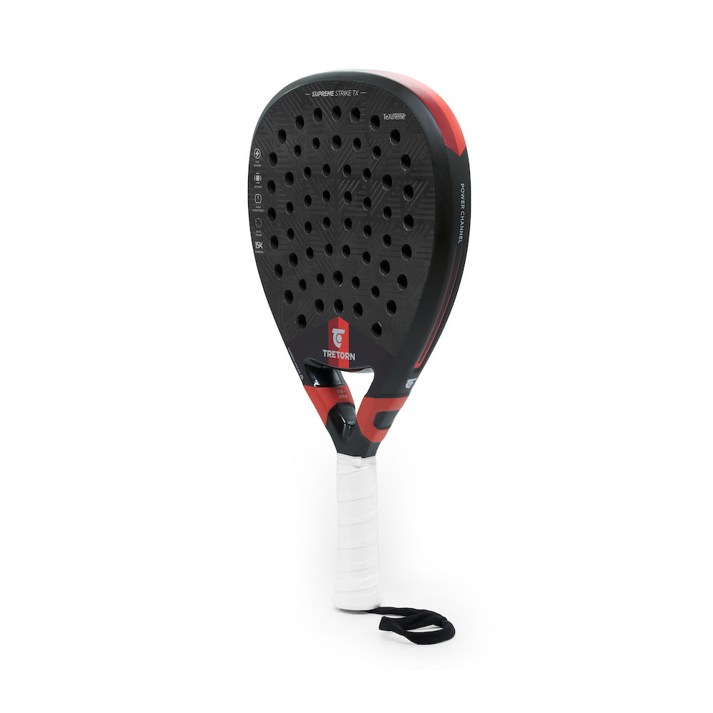 Experience the power of SUPREME STRIKE TX! Designed with precision and innovation to give you an edge in your offensive game. SUPREME STRIKE TX is developed for experienced players. The racket is equipped with a 15K carbon fiber layer from Swedish TeXtreme®, which is a thinner, stronger, and more durable surface layer that provides a quicker response compared to traditional carbon fiber constructions. Experience a new level of speed and sensation in every shot. With our EVA POWER core and a high sweetspot, the result is an extremely responsive power racket for players who mostly use their offense to dominate the game. Whether you unleash a thundering smash or execute a perfectly placed drop shot, SUPREME STRIKE TX delivers outstanding performance with every shot. The racket is also equipped with a DUAL-hole pattern that optimizes the racket's contact points, enhancing the ability for controlled shots even when hitting outside the racket's sweetspot. The result? Consistent power and precision that allow you to decide the pace of the game. Additionally, the racket features a multi-directional 3D decal, strategically designed to enhance your spin for all types of shots, bringing a new level of elegance that confuse your opponents and keeps them guessing about your next move.